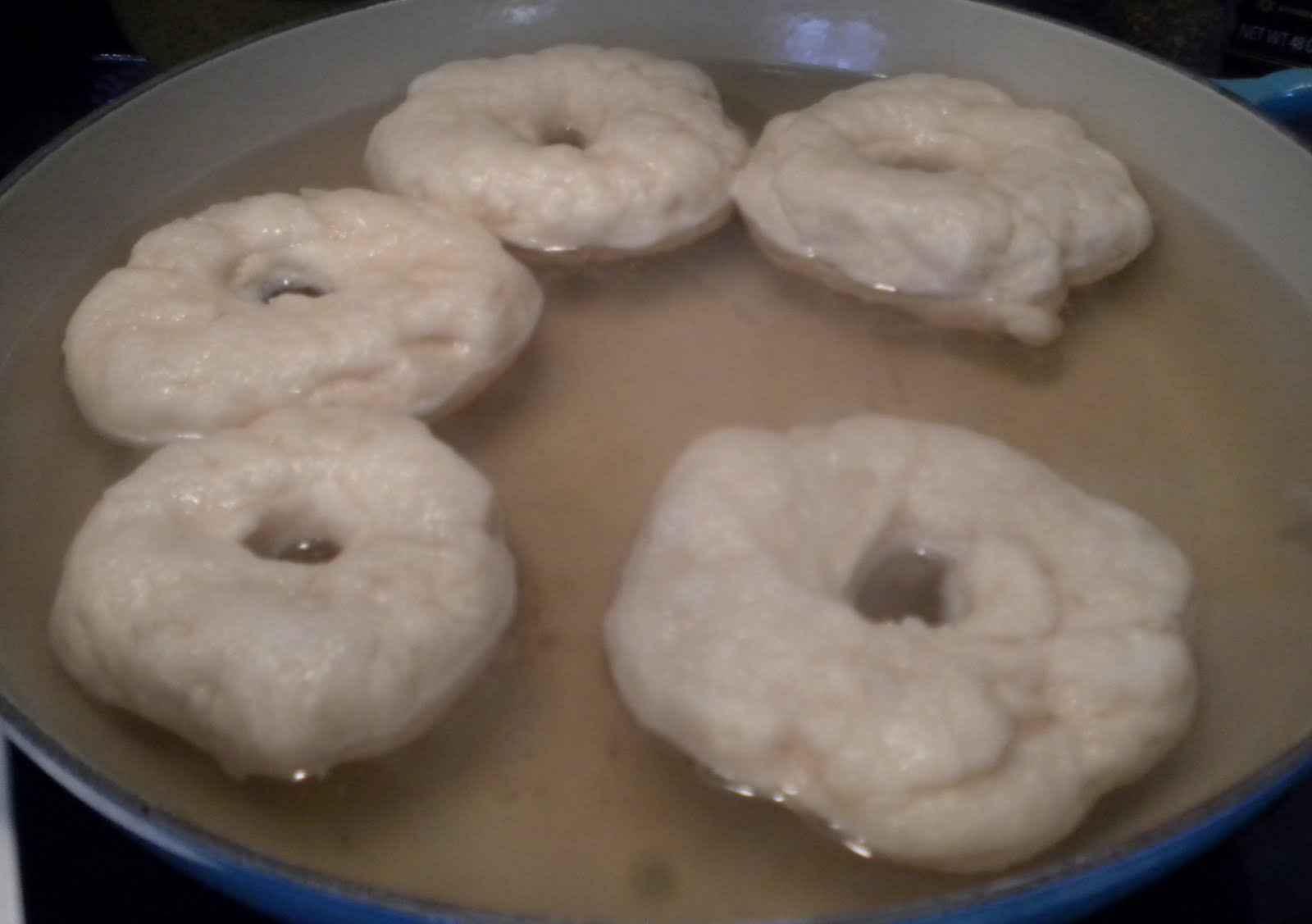 While the dough is resting, prepare the water bath by heating the water and malt (or sugar, which I used) to a very gentle boil in a wide-diameter (about 10") pan. A 10" electric frying pan works well here. Preheat your oven to 425°F.